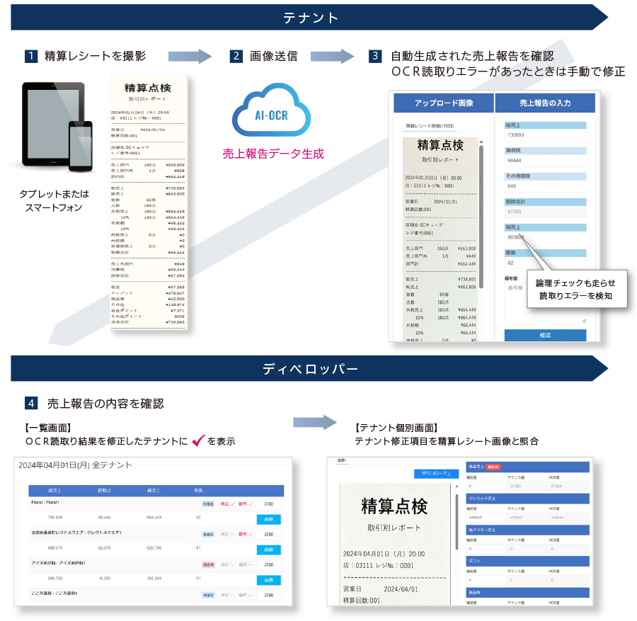 ディベロッパーにとっては煩雑な売上チェック・修正・確定業務をAI-OCR技術で革新。